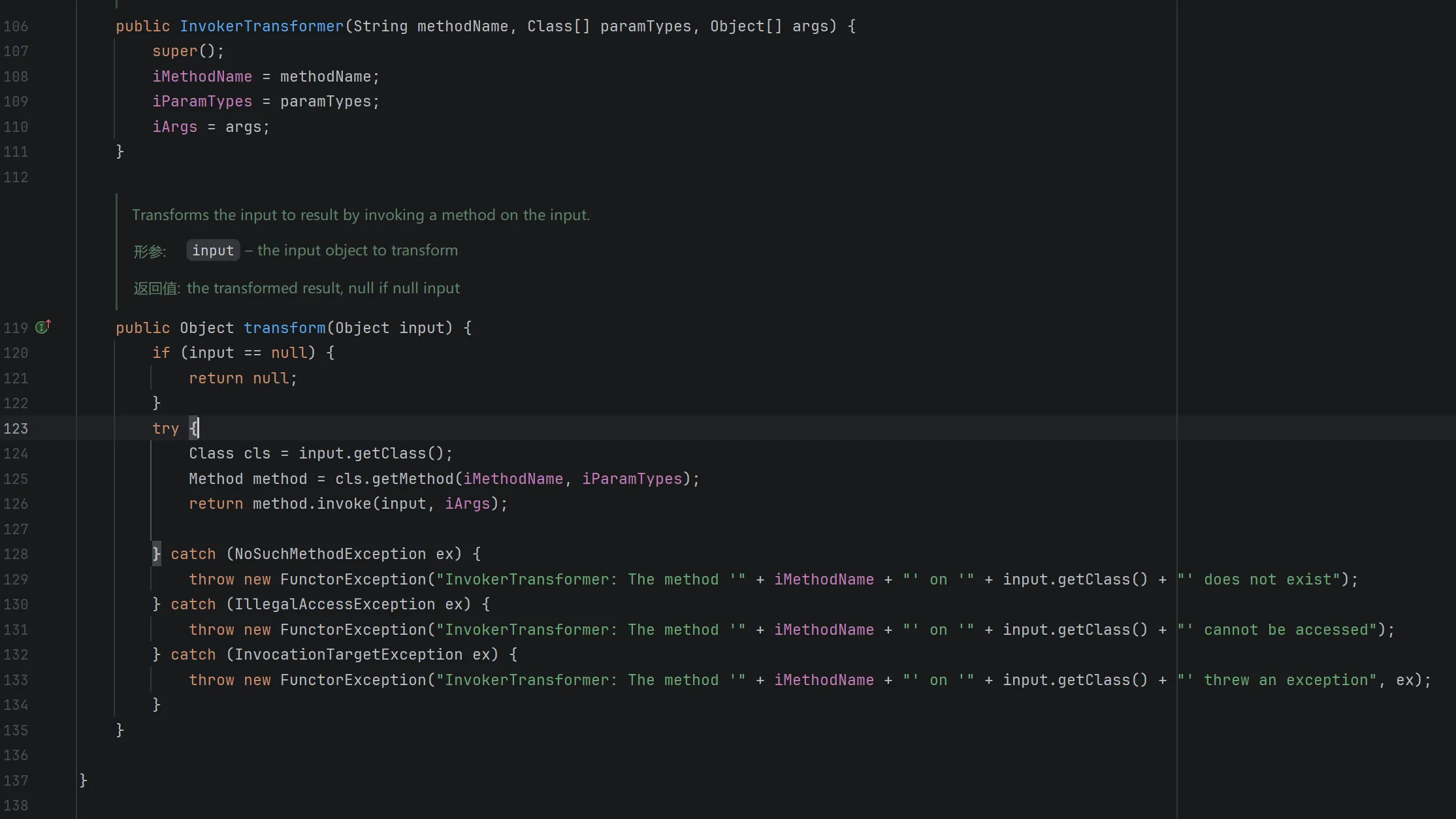 整条链子需要用到 InvokerTransformer,ChainedTransformer,ConstantTransformer 三个实现,现在看最主要的 InvokerTransformer:
