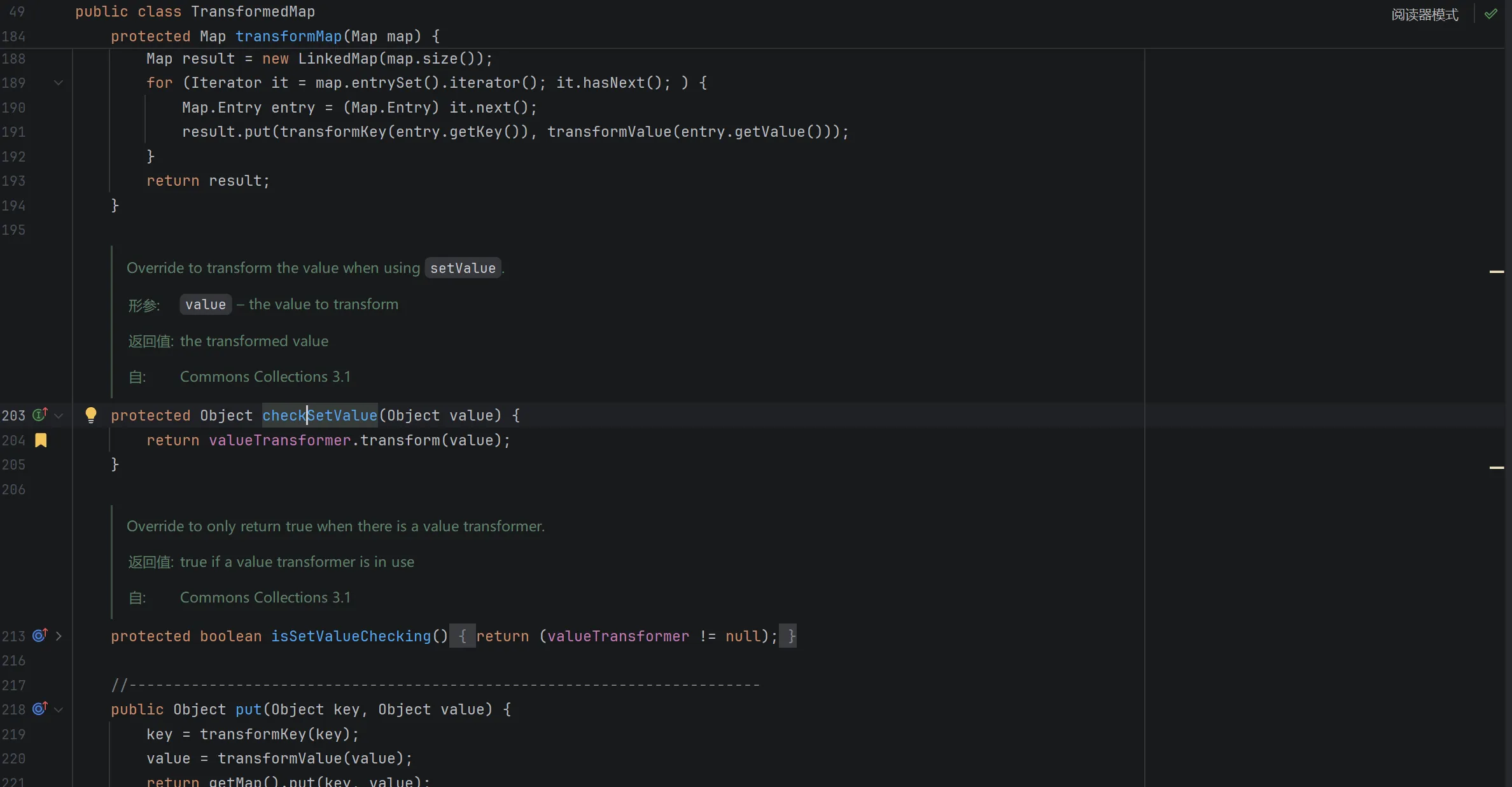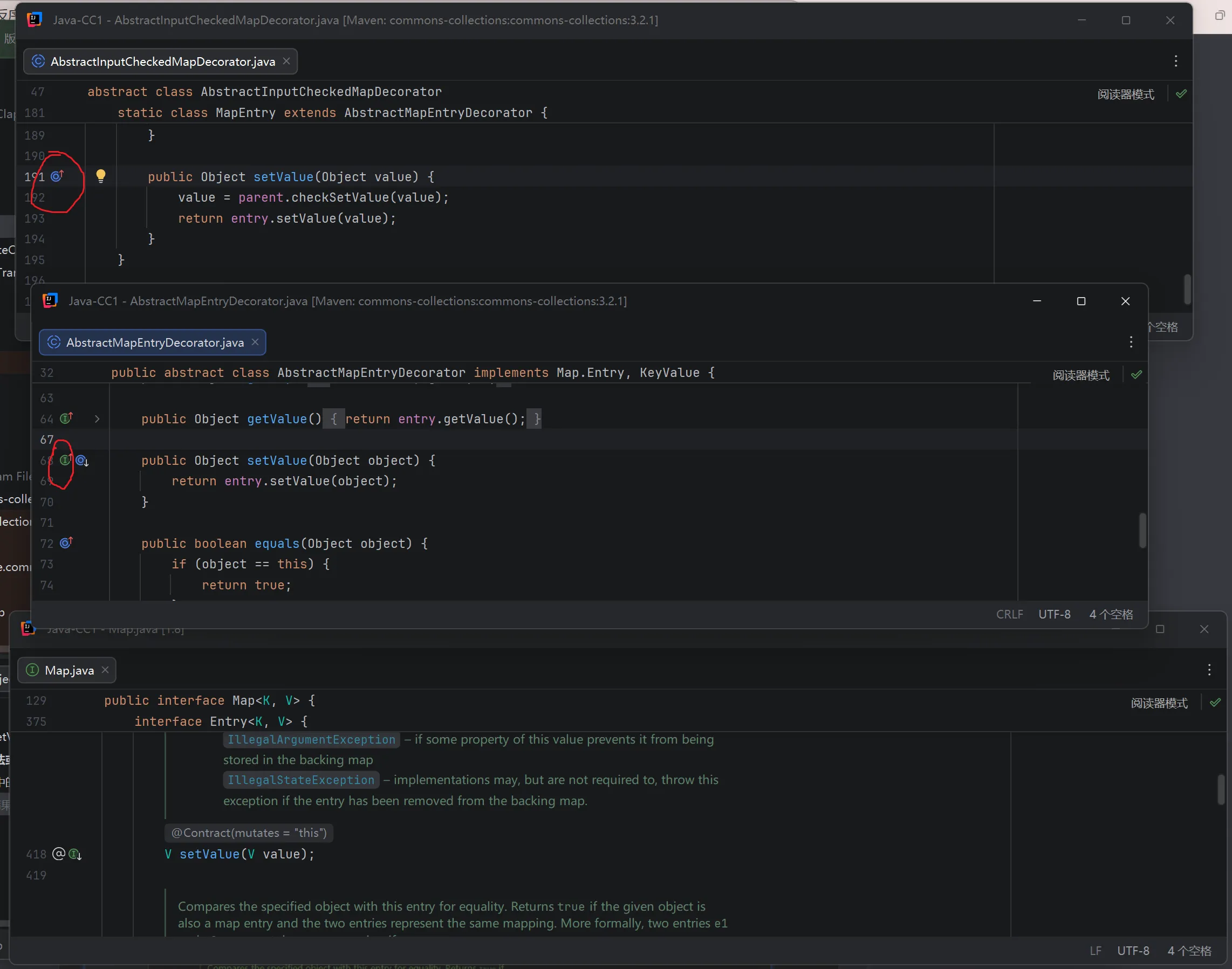 在 AbstractInputCheckedMapDecorator.MapEntry.setValue 方法和 TransformMap.checkSetValue 方法里打上断点,调试发现确实会停在这两个断点处