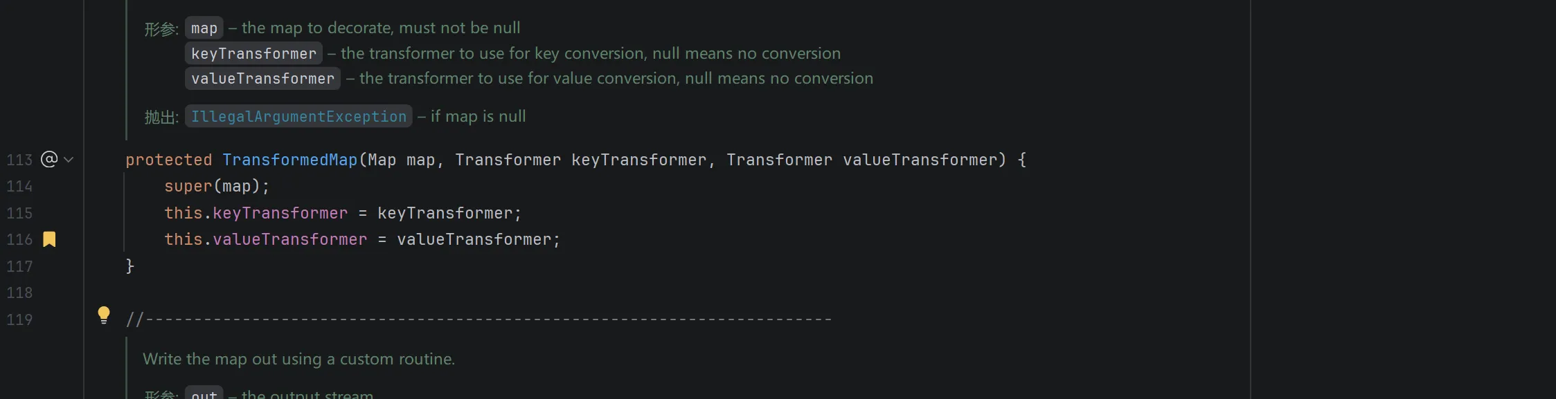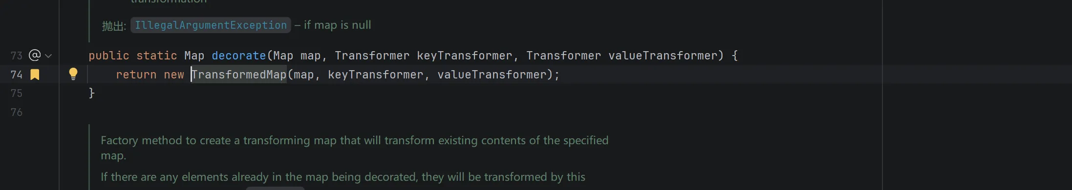 但是构造函数是 protected 的,寻找发现在 decorate 静态方法中创建了 TransformMap 对象(这是一个工厂方法):