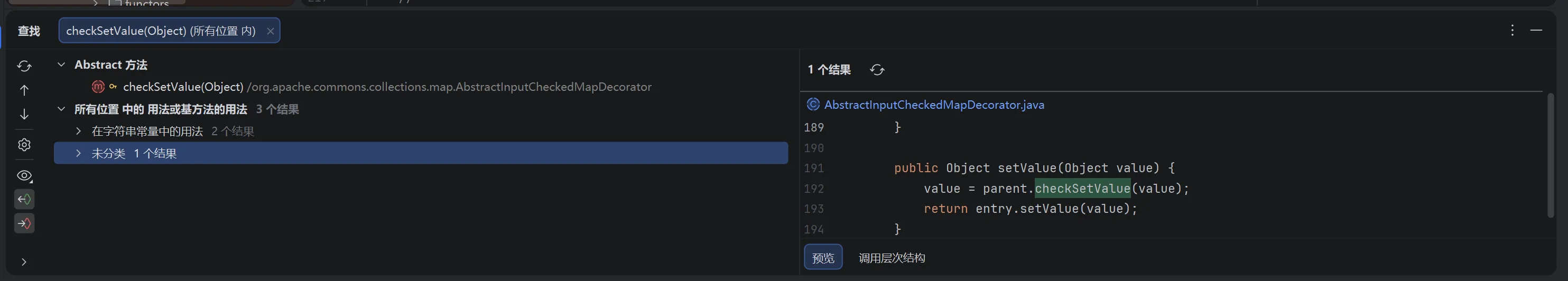 发现 AbstractInputCheckedMapDecorator 类的内部类 MapEntry 的 setValue 方法调用了 parent.checkSetValue(value)